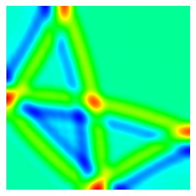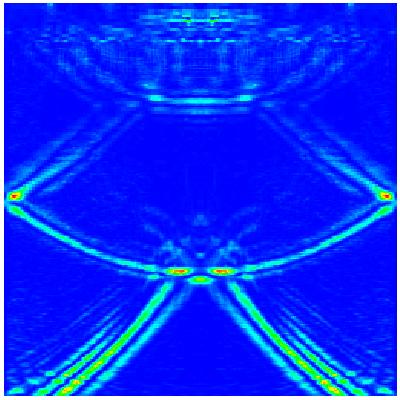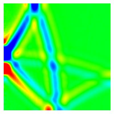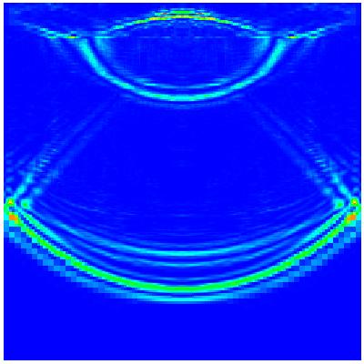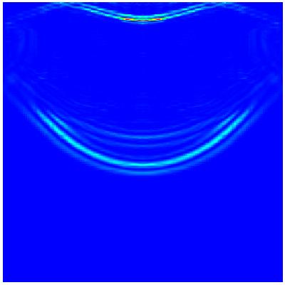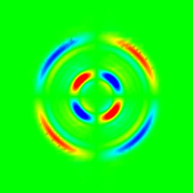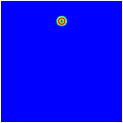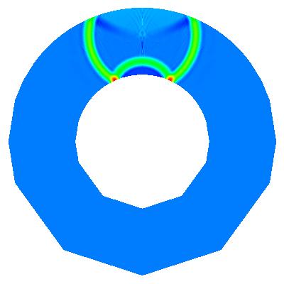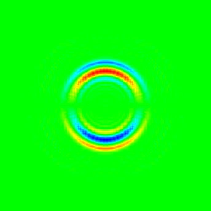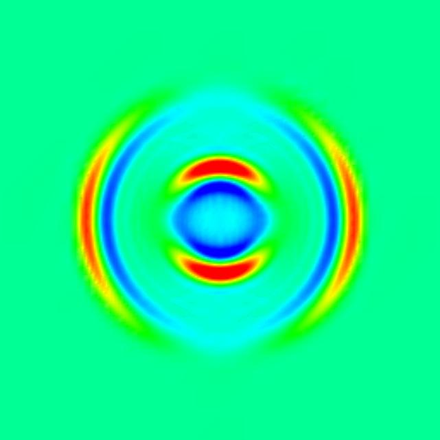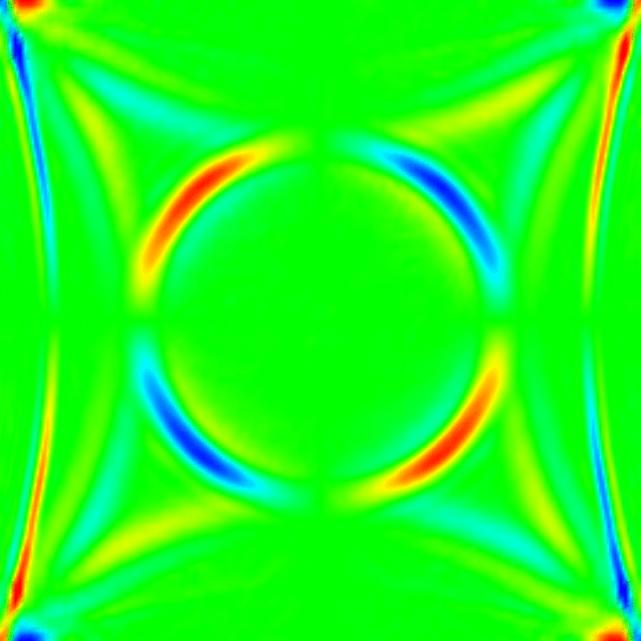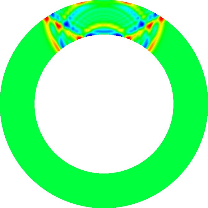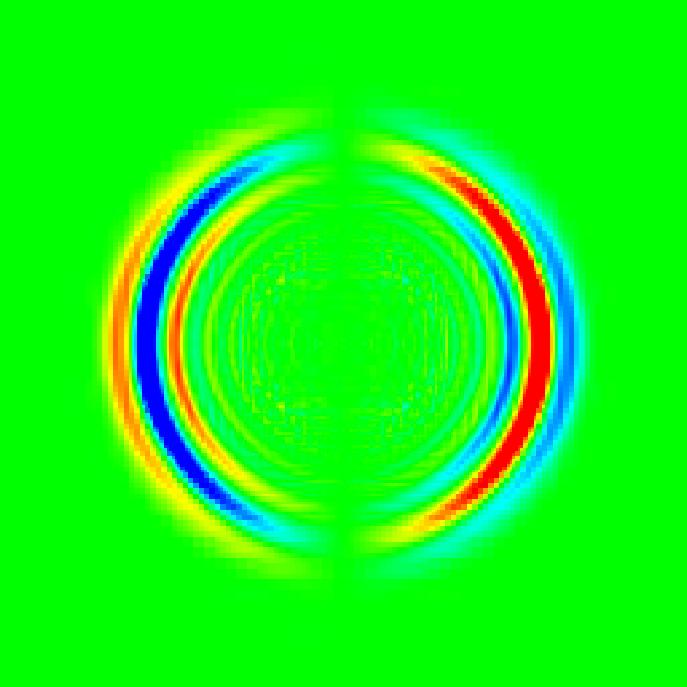 Posing such boundary conditions is not simple for more than one space dimension. A common approximation is the first order condition by Bayliss and Turkell (or Engquist and Majda), but it is not the exact boundary condition and generates spurious reflections. These can be seen in the pictures above: the dark blue wave in the second picture is a spurious reflection of the original wave at the outer boundary, while the physical reflection of the initial wave from the sphere in the center can clearly be seen. As time proceeds the initial wave travels forth, and is diffracted from the sphere, as can be seen in pictures 4-6. In the last picture, the original wave has left the domain and only that part that was diffracted can be seen, where the two parts coming right and left around the sphere presently meet at its bottom. However, the blue spurious reflection from the beginning travels all along and is more intense in the last picture even than the diffracted part of the original wave. (Note that the scales of the pictures vary, so that the spurious wave does not gain in intensity during time, only the extreme colors move to lower amplitudes of the waves. Please also excuse the missing pieces at the left and right edges - I have no clue what is going on here, in any case the program is computing with a spherical outer boundary.)