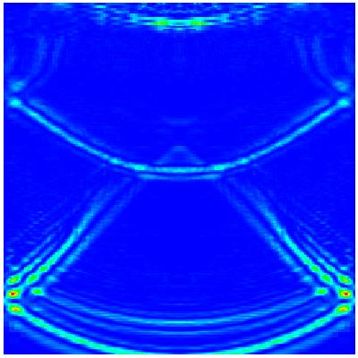 Sometimes, it is not necessary to go to some lengths in inventing exactly absorbing boundary conditions, but approximate ones are sufficient. The pictures above and the movie shows an example of such a boundary condition in action. The domain here is thought to represent the earth crust, from the surface down to the Moho discontinuity at a depth of 30 km. It is (very crudely) approximated by three layers, one low density low wave speed layer at the top of 3 km depth, a high density high wave speed layer between 3 and 6 km depth, and below that a layer of medium density and medium wave speed. No attenuation is included in the model. Then a source is placed into the middle layer and we track how the waves travel outwards (the reflecting vertical sides are unphysical, so please ignore them) and eventually hits the lower boundary. The Moho discontinuity is usually considered an absorbing boundary, so we here simulate it by a simple first order absorbing boundary condition. You can readily see that the waves in the pictures and movie are absorbed without noticable reflections there.
