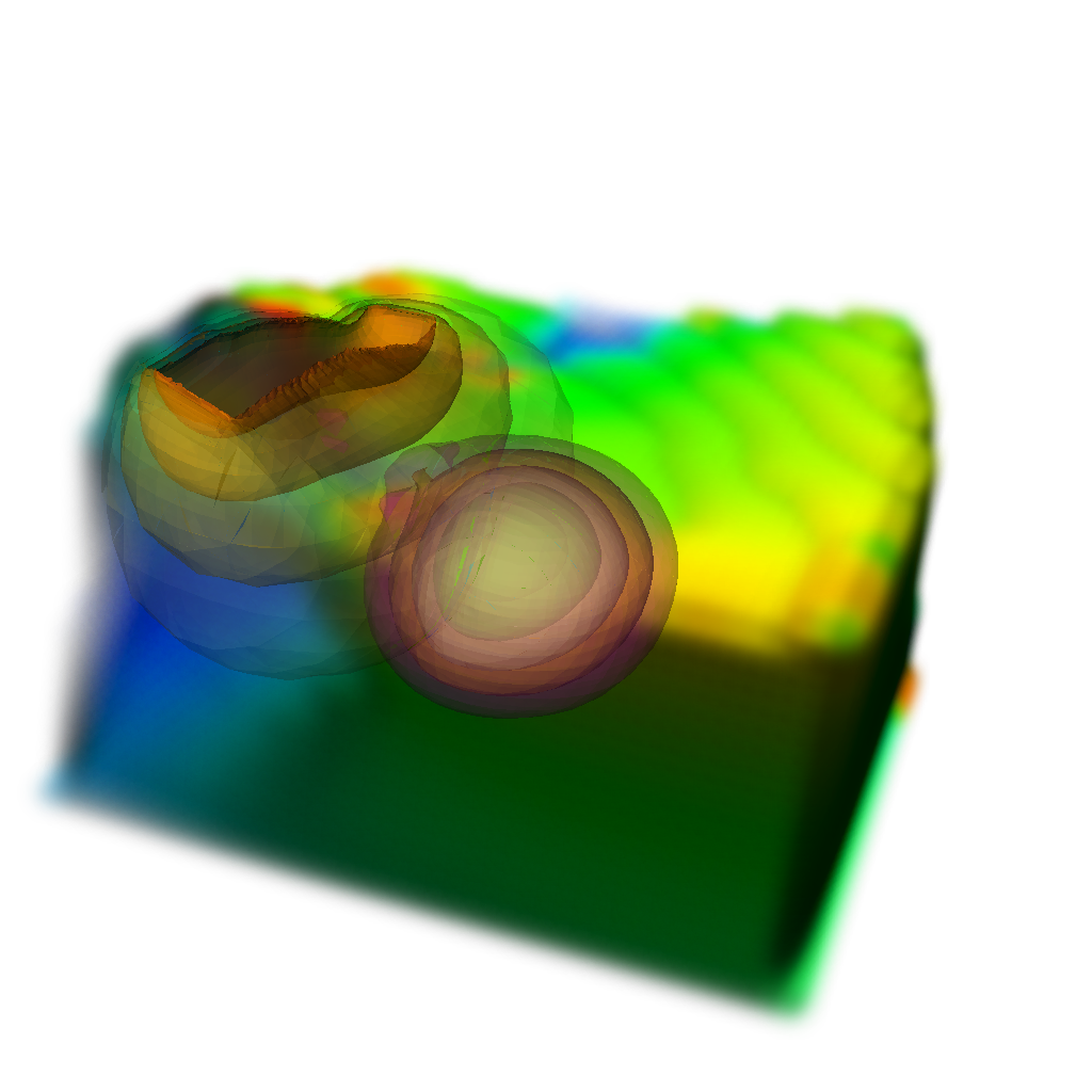 The incident light is absorbed by regular tissue as well as a fluorescent dye that is injected and that is specific to tumor cells. The dye then re-emits light at a different wave length that we then detect; the intensity of this fluorescent light is shown in the first three images by the isosurfaces centered at the tumor at the middle of the domain.