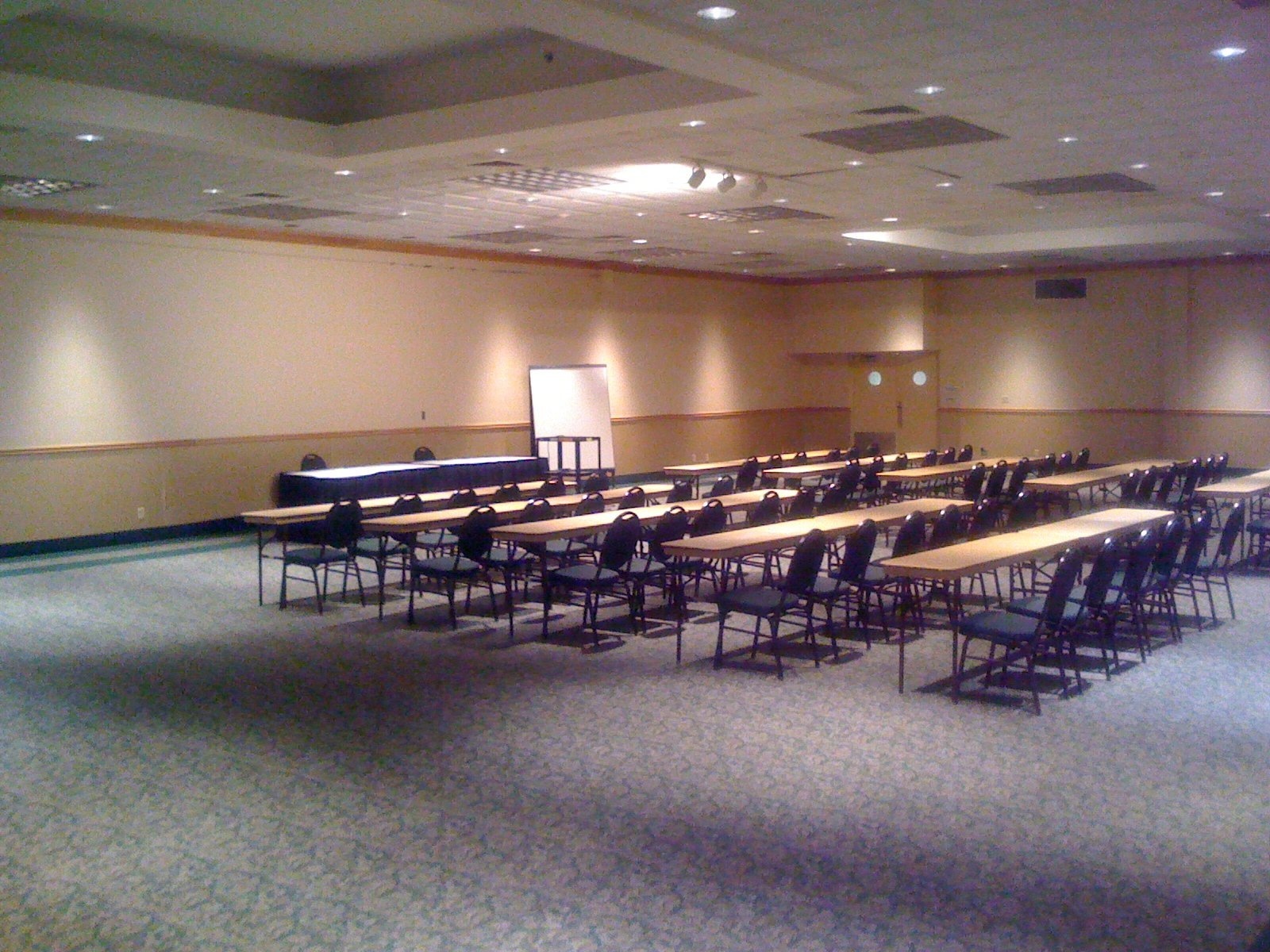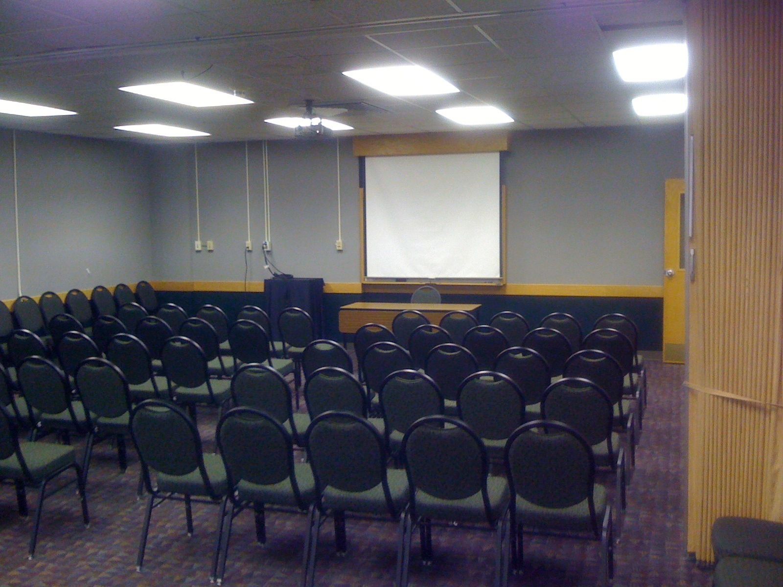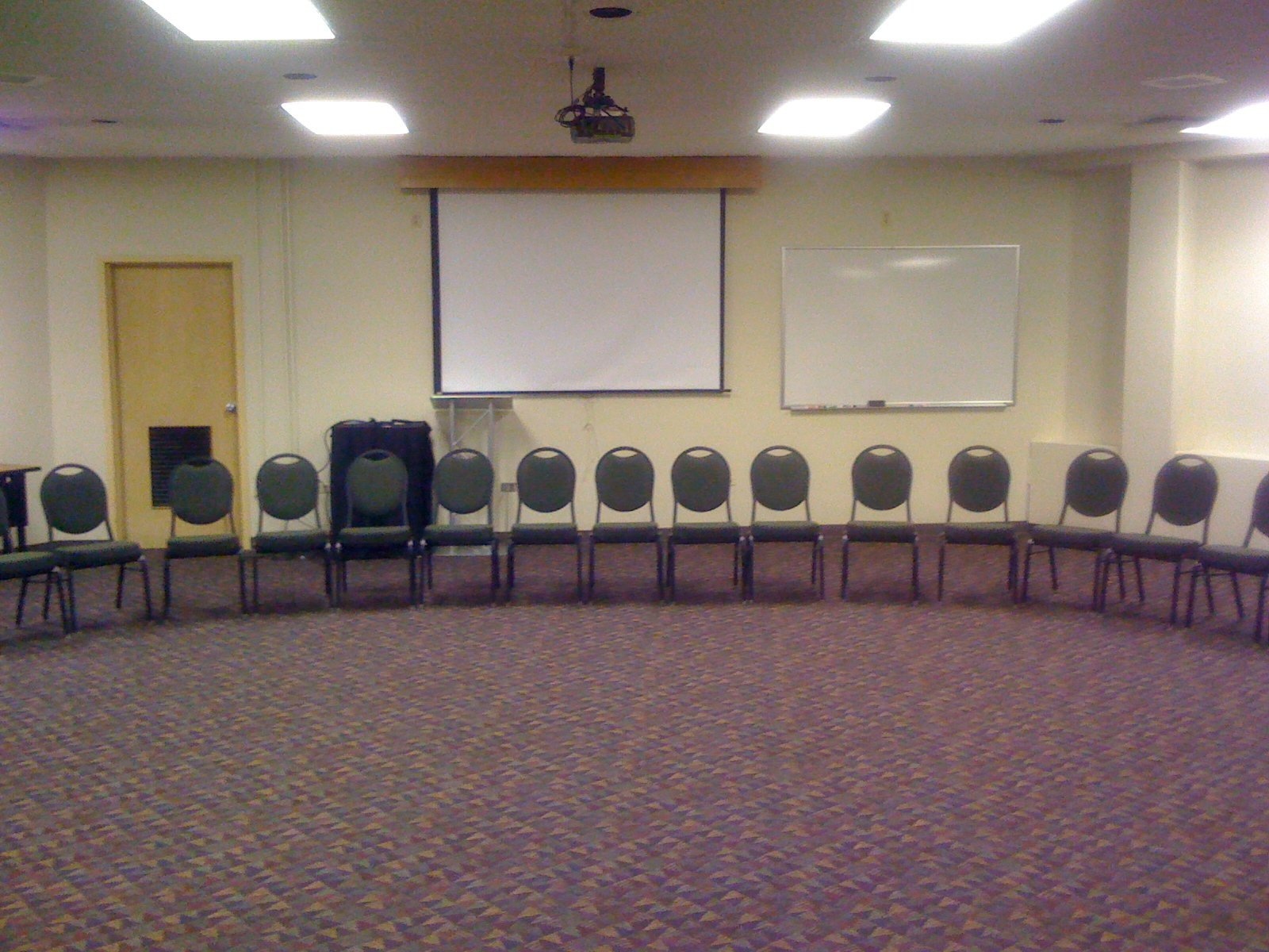 Room with small whiteboard | The large lecture room (North Ballroom) Very good Data Projector and Screen (hidden in photo) but no board |